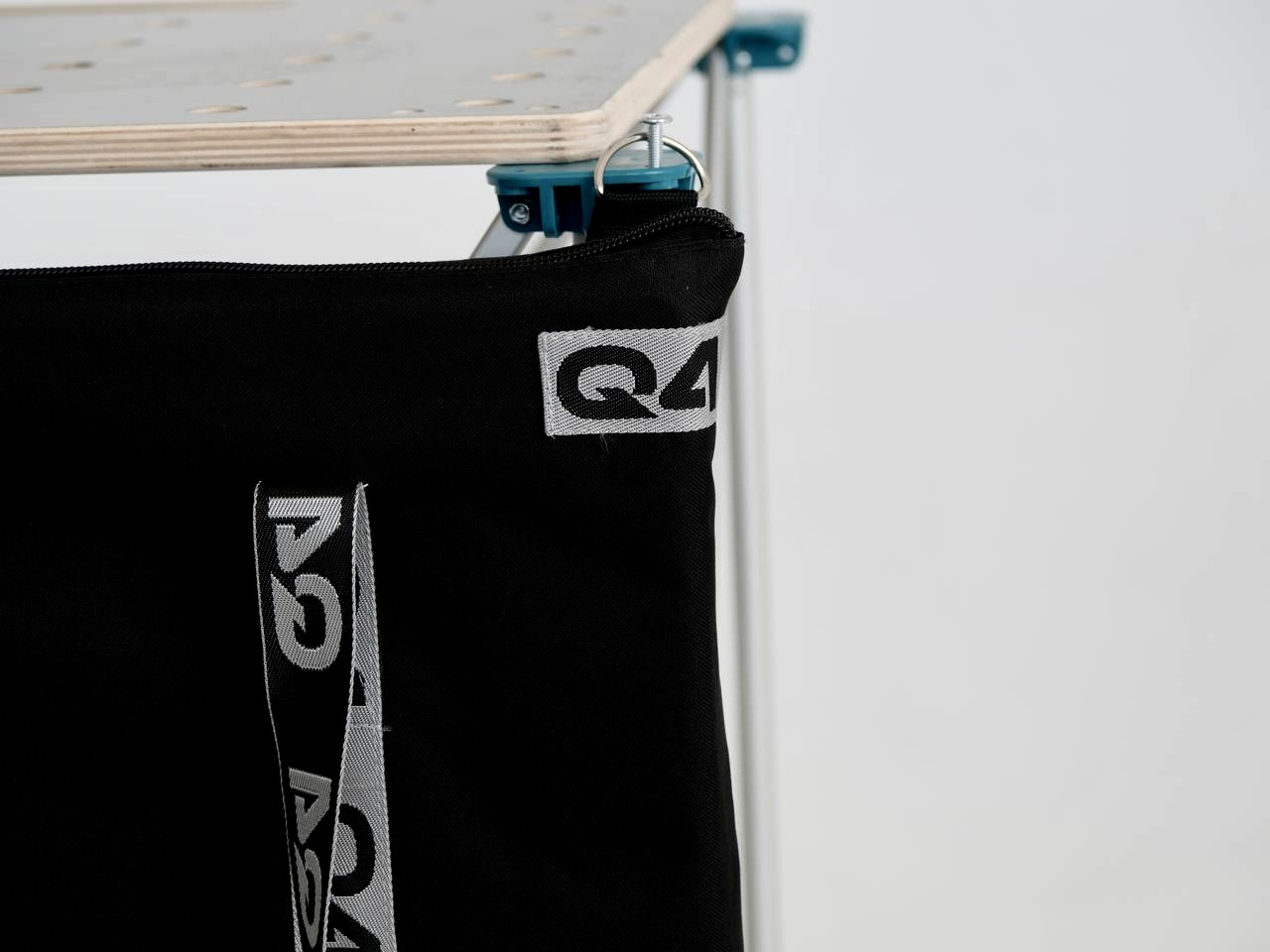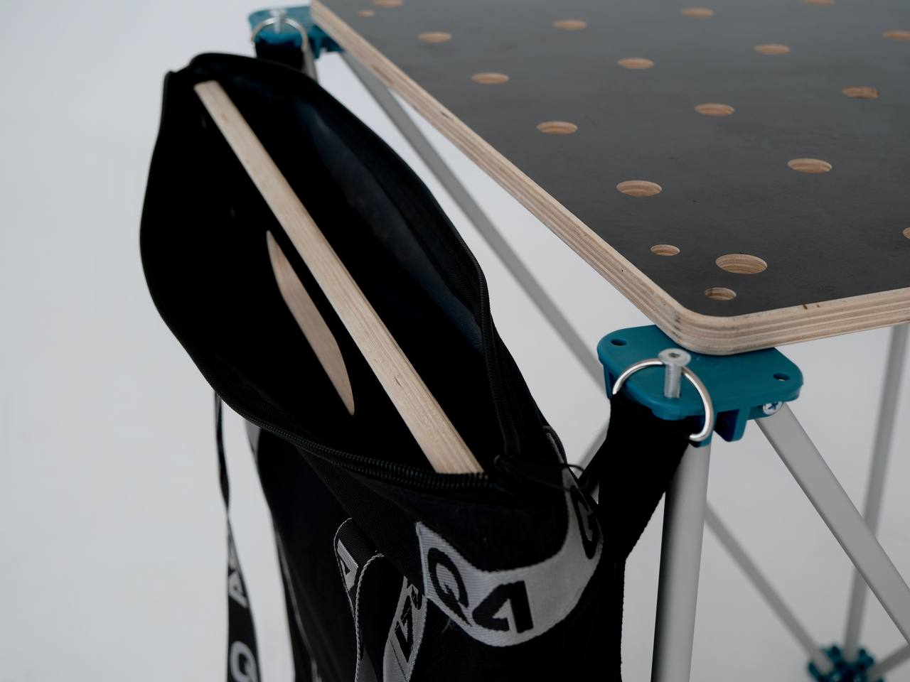 - В комплекте к сумке идут винты М6 для крепления в пластиковые опоры стола, на которые подвешивается сумка за счёт металлических колец. Таким образом, сумка становится дополнительным карманом-мешком к столу. Этот карман можно использовать для хранения или как временный мешок для сухого мусора и обрезков.