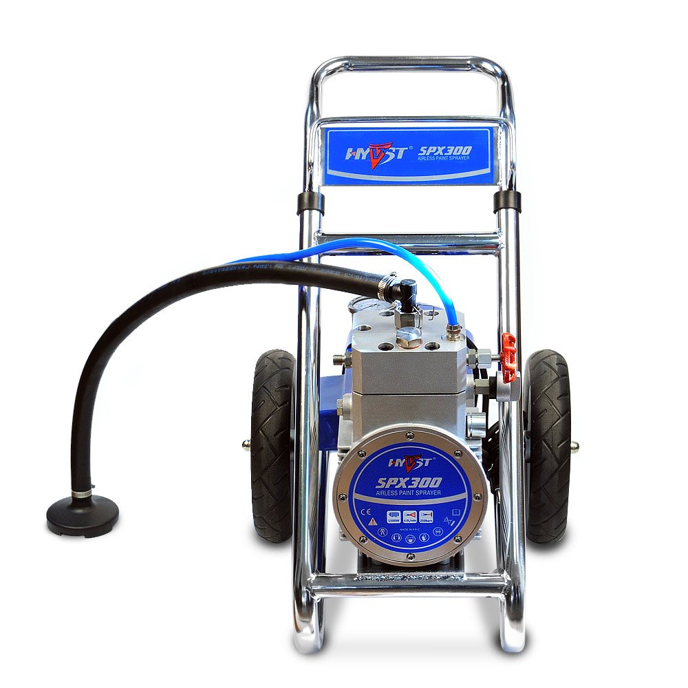 HYVST SPX 300 - мембранный окрасочный аппарат для окраски безвоздушным краскораспылителем. Окрасочный аппарат используется на строительных площадках, применяется для покраски стен, потолков, фасадов водными, акриловыми и фасадными красками. Окрасочный аппарат также можно применять для окраски металла масляными красками. Вязкость распыляемых красок должна не превышать вязкость 3 % кефира. После окраски агрегат должен промываться теми же растворителями, которыми разбавляется краска. Окрасочный аппарат может работать только на один малярный пост. Максимальная длина шлангов от окрасочного аппарата 30-45 метров.