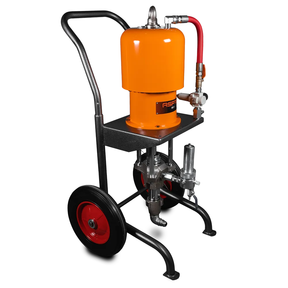Шток пневматического двигателя АСПРО 68:1 имеет механическую связь со штоком поршневого насоса высокого давления, распыляющий ЛКМ методом безвоздушного распыления.