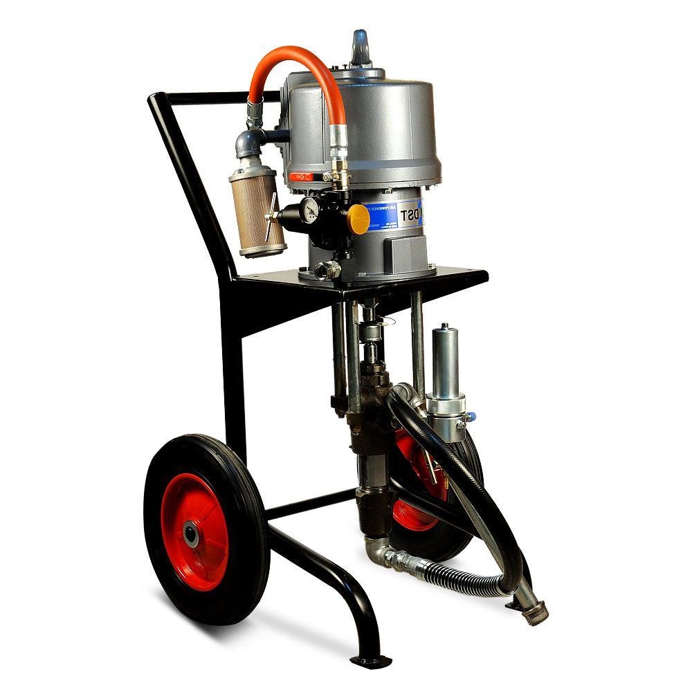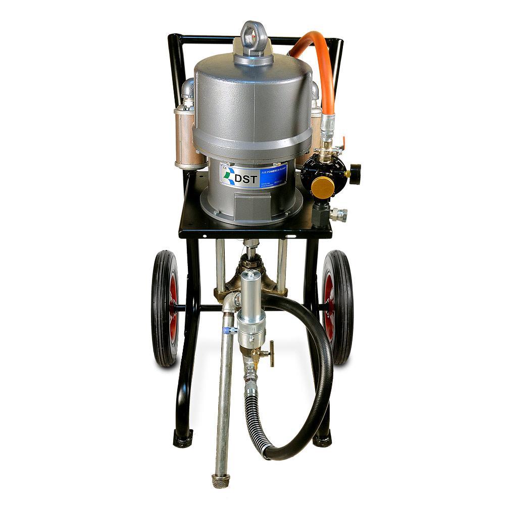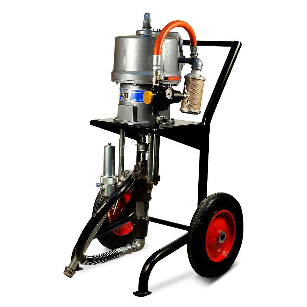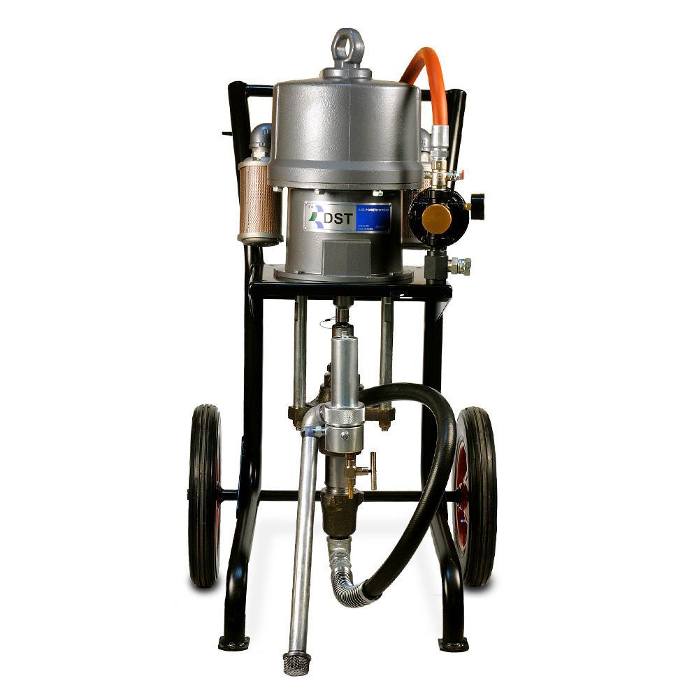 DSTech N270-N951 - поршневой агрегат для окраски безвоздушного распыления вязкой краски, работающий от сжатого воздуха из компрессора или от заводской пневматической сети. Окрасочный агрегат предназначен для промышленной окраски на заводах по производству металлических конструкций, вагонных заводах, на производствах, где требуется массовая покраска однотипных изделий одной и той же краской, также аппарат применяется для антикоррозионной покраски, обработки металла цинконаполненными красками, покраски мостовых конструкций, также аппарат применяется для покраски многоэтажных домов, в условиях, когда требуются экстремально длинные шланги, также агрегат применяется для окраски кораблей в судостроении и судоремонте, когда нет возможности передвинуть окрасочный аппарат и приходится красить на достаточно большом удалении от аппарата, также аппарат применяется при нанесении гидроизоляции и огнезащиты. Окрасочный агрегат может красить круглосуточно, так как он охлаждается от краски. Агрегат может распылять безвоздушным способом краски на водной основе и краски на растворителях. С красками средней вязкости он может работать на два-три малярных поста одновременно.