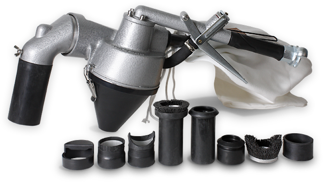 Для улавливания абразива на неровных поверхностях в комплекте имеются специальные фигурные насадки, которые позволяют создавать разряжение. Абразив возвращается назад в бункер для повторного использования, а пыль отправляется в фильтр-мешок. EDUCT-O-MATIC за один проход очищает полосу шириной 30 мм. После прекращения абразивоструйной очистки оператор должен не полностью отпустить ручку, а удерживать ее в промежуточном положении около 2-3 х секунд, чтобы полностью произошел отсос пыли и абразива с очищаемой поверхности. Полное отпускание ручки остановит вакуумный отсос.