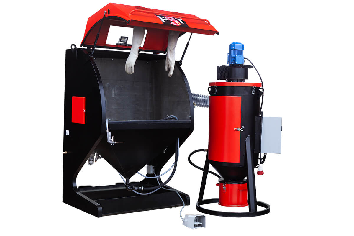 Напорная пескоструйная камера PST отличается от инжекторной способом транспортировки абразива к соплу внутрь камеры. Напорный тип этих установок характеризуется высокой мощностью воздушно-абразивной струи, скоростью вылета ее частиц, поэтому в ней можно обрабатывать больше изделий за единицу времени, чем в инжекторной, производить глубокую очистку в труднодоступных местах изделия.