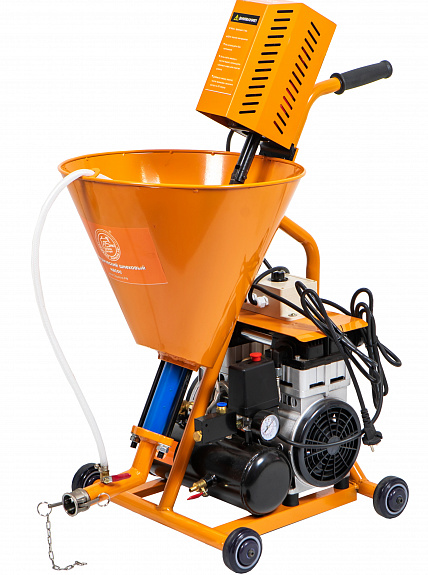 Шнековый насос приводится в действие электродвигателем. Материал из бункера подается шнековым насосом в растворный ствол или пистолет (в зависимости от комплектации). Сжатый воздух поступает от компрессора, установленного на раме агрегата в пистолет (растворный ствол). Распыление материала происходит пневматическим методом, т.е. раствор, подаваемый насосом, смешивается с жатым воздухом и "растворо-воздушная" смесь распыляется на поверхность. Величина капель смеси регулируется количеством сжатого воздуха и количеством раствора. Регулировка оборотов привода насоса осуществляется потенциометром на блоке управления.