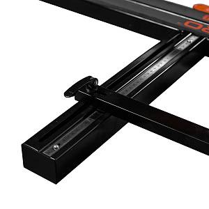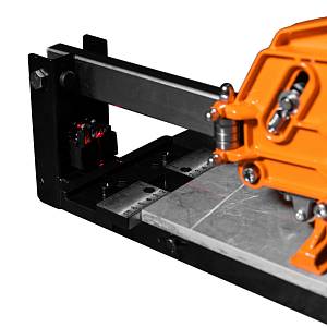 Устройство плиткореза ASPRO-MTC1 представляет собой рабочий стол-станину с направляющей рельсой, по которой перемещается режущий блок. Монорельсовая конструкция обеспечивает жесткость и прочность, что предотвращает изгибание при разделении плитки. Режущий блок включает в себя каретку с резцом и разделителем, а также мощную рукоятку для создания максимального давления на разделяемый материал.
